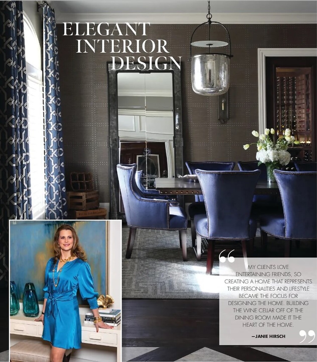 In the article "Elegant Interior Design" interior designer Janie Hirsch featured Rivets 5719 Nickel On Graphite Manila Hempin the dining room of a clients home.