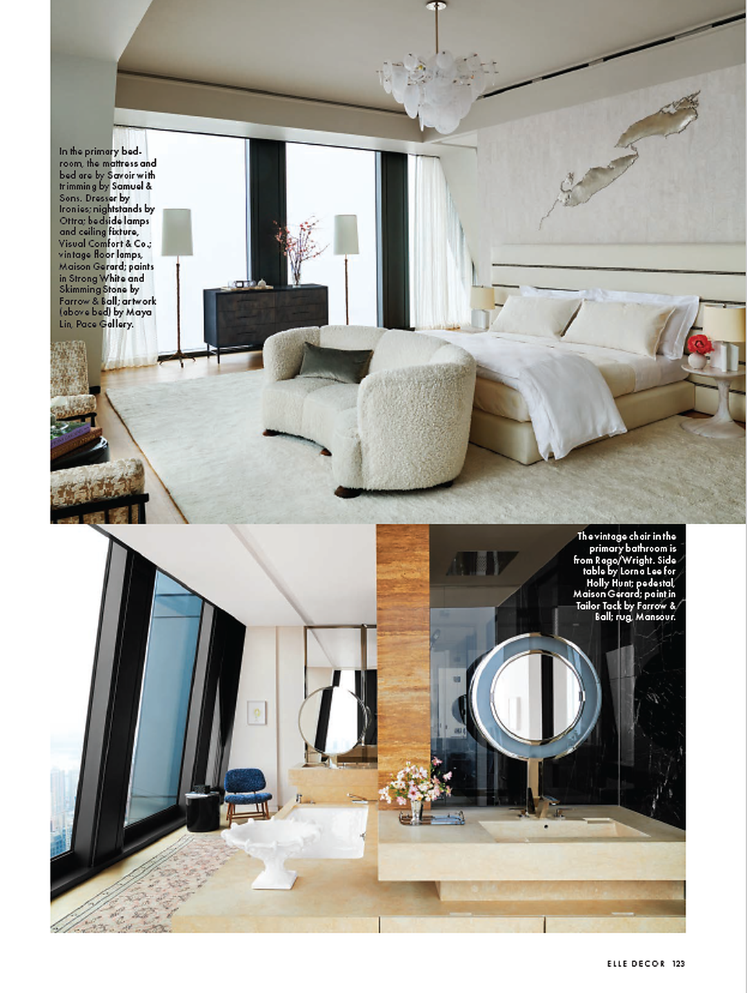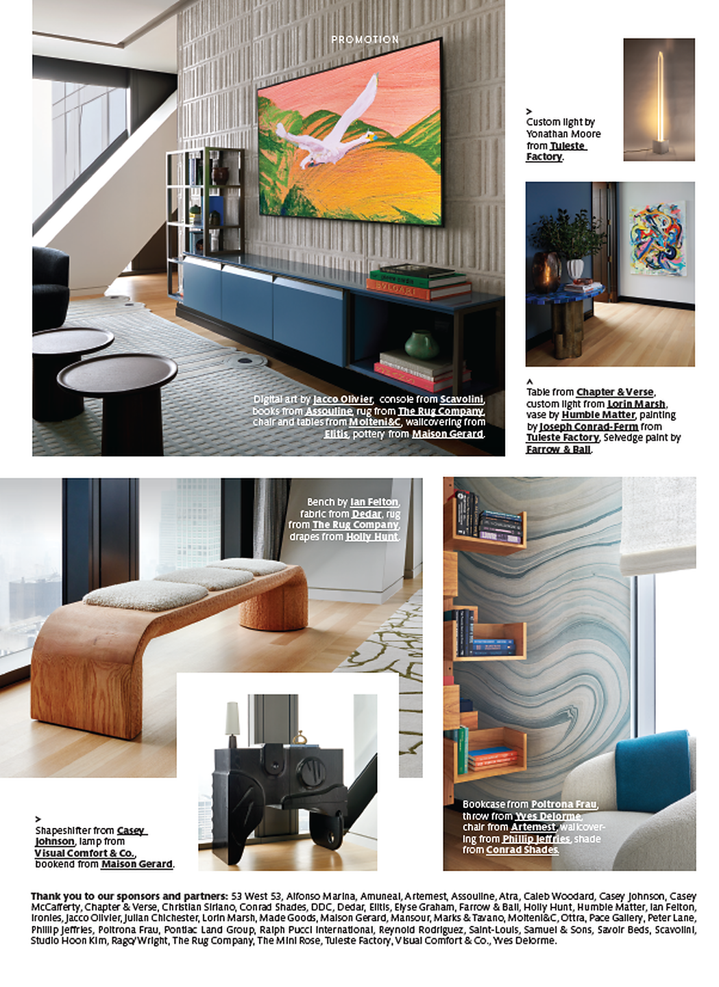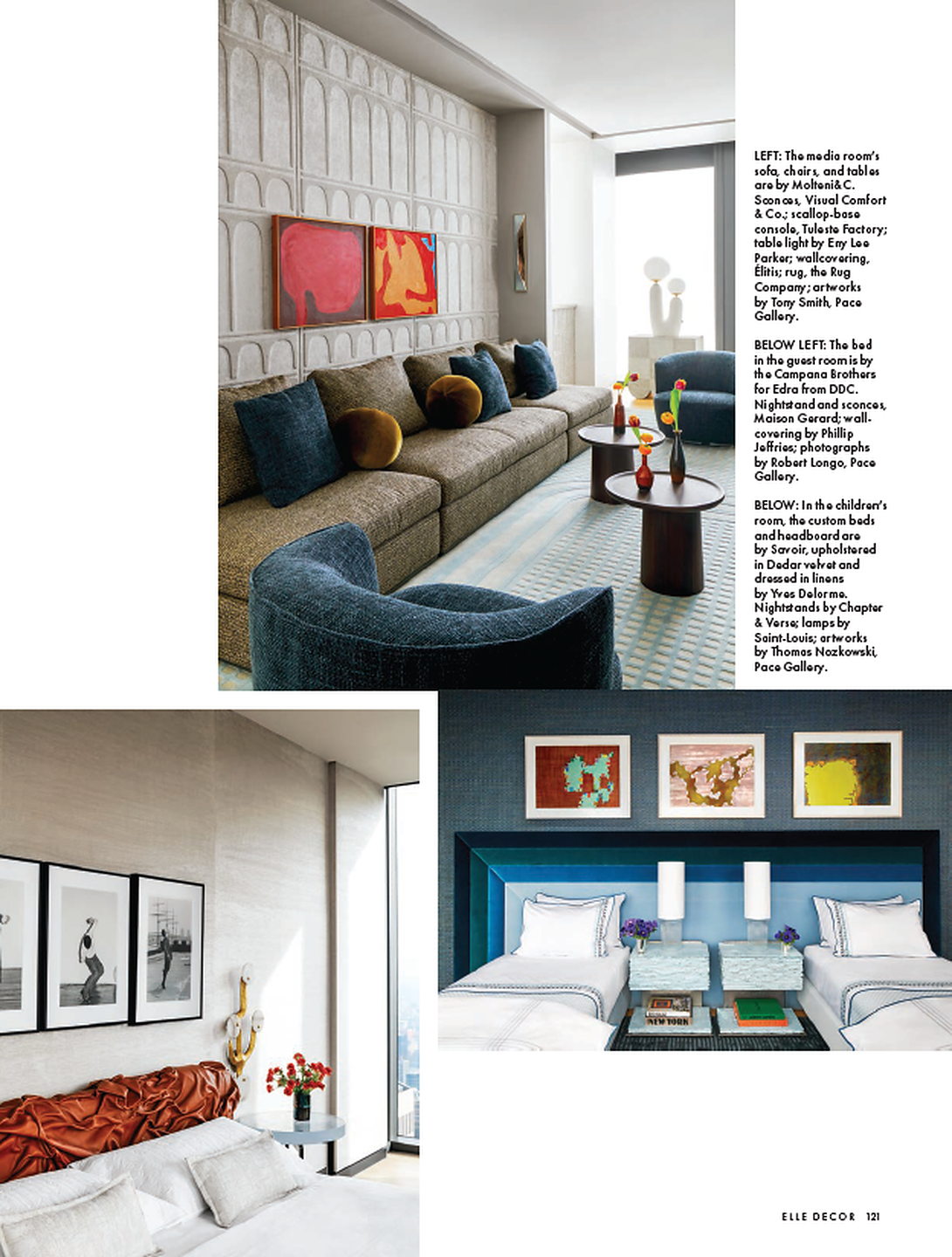 In article, "On Cloud Nine," Fox Nahem featured in the ELLE DECOR 53 West 53 penthouse, Sculpted Wood 2811 Parisian Pale in the primary bedroom, Dojo Weave 8621 Navy Plait in a bedroom, Velvet Vibes 9465 Craft Paper Tan in a bedroom, and Ripples 9265-A Bookmatched Taupe on Marshmallow Manila Hemp in the  Media Room Nook.