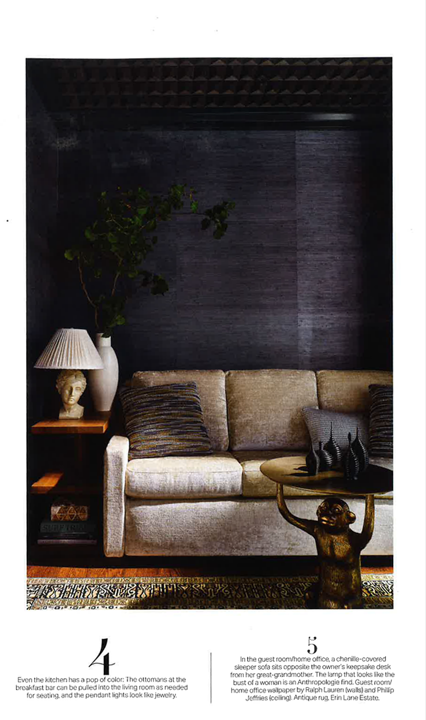 In article, "City By the Bay Power Play," interior designer Ashi Waliany of Cusp Interiors featured Coffered Woods 4261 Charcoal on the ceiling of a client's living room.