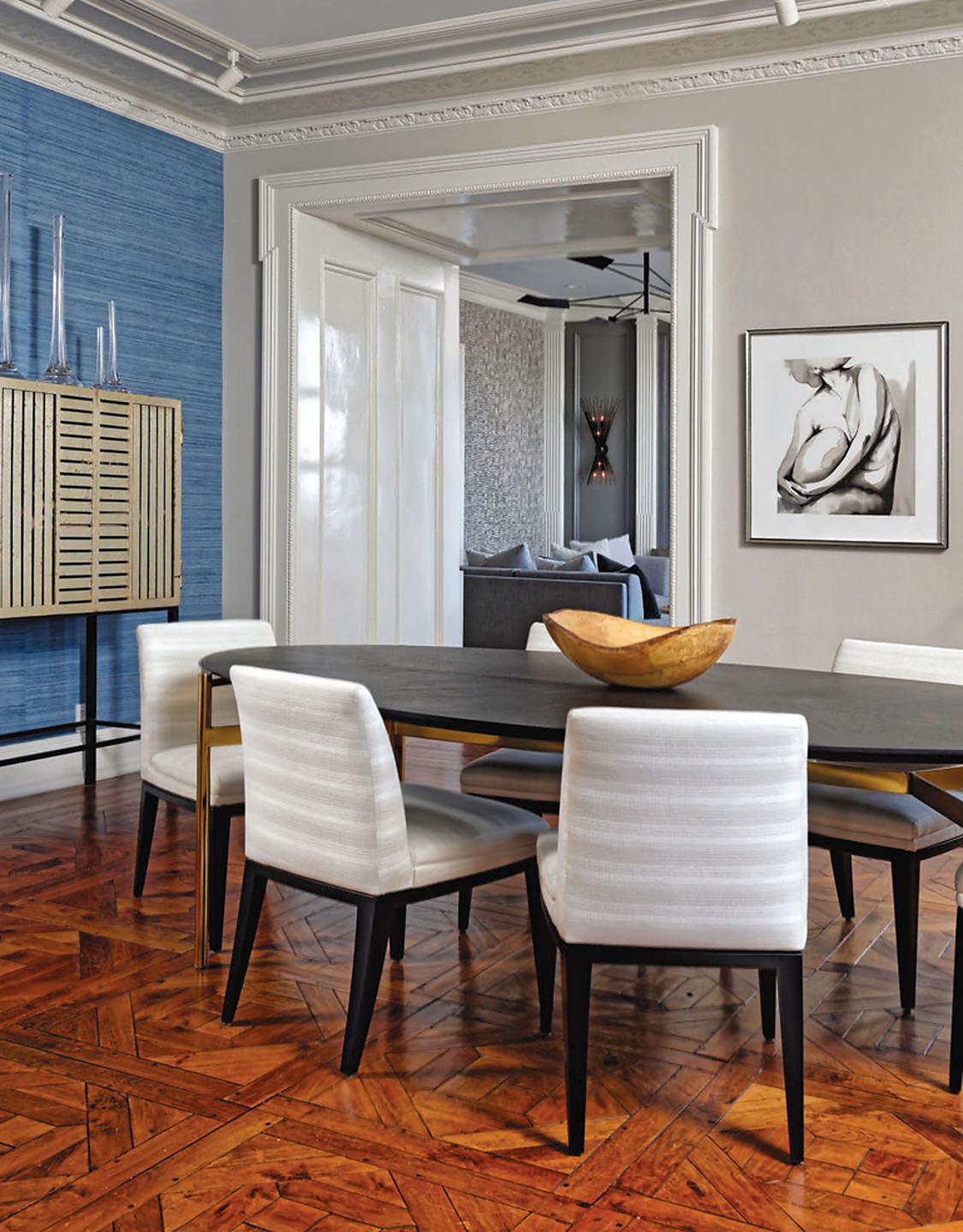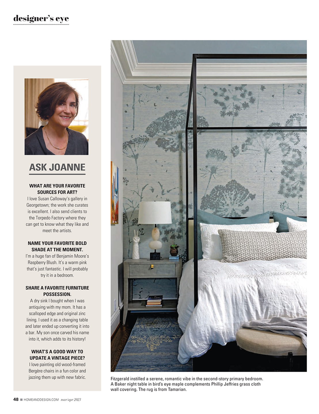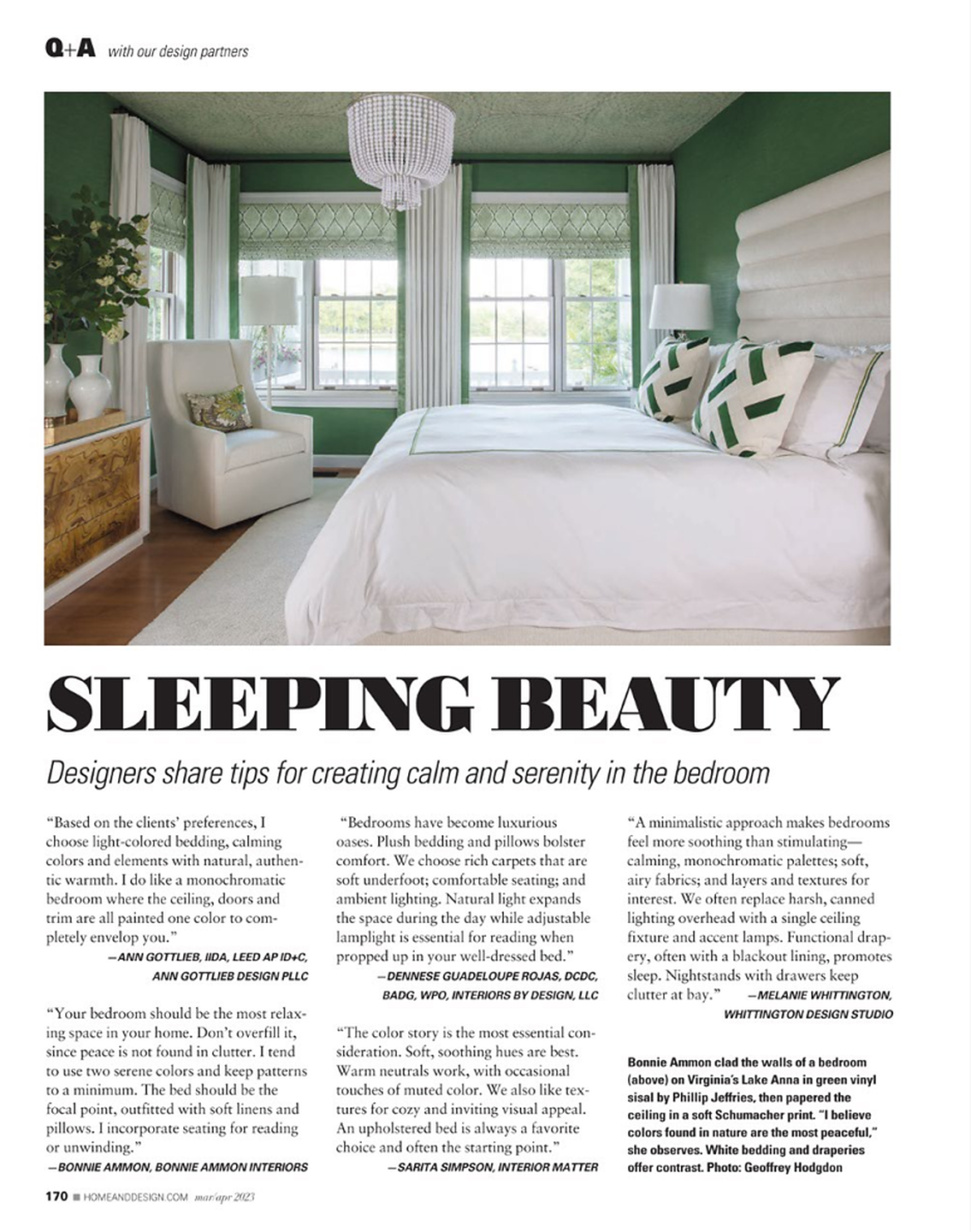 In article, "Fresh Vibe," interior designer Gatega Interior Design featured Wish 6102 Metallic Whim on Moonlight Silver Star Dust Silk in the bedroom and Amalfi Silk 4362 Sparkling Seas in the dining room of a client's home. In article, "Sleeping Beauty," interior designer Bonnie Ammon featured Vinyl Sisal 8493 Stately Green in the bedroom of a client's home.