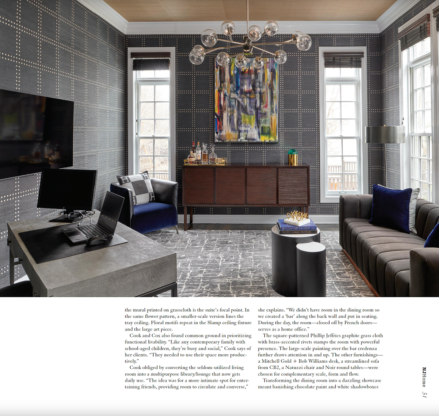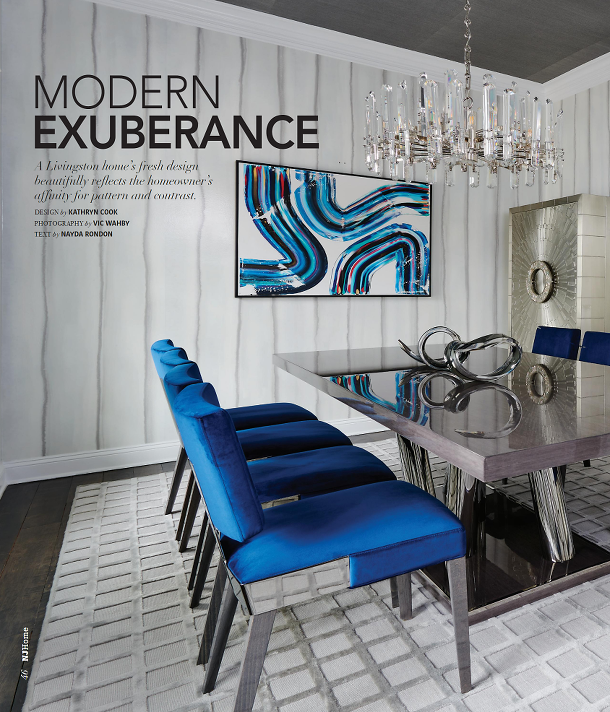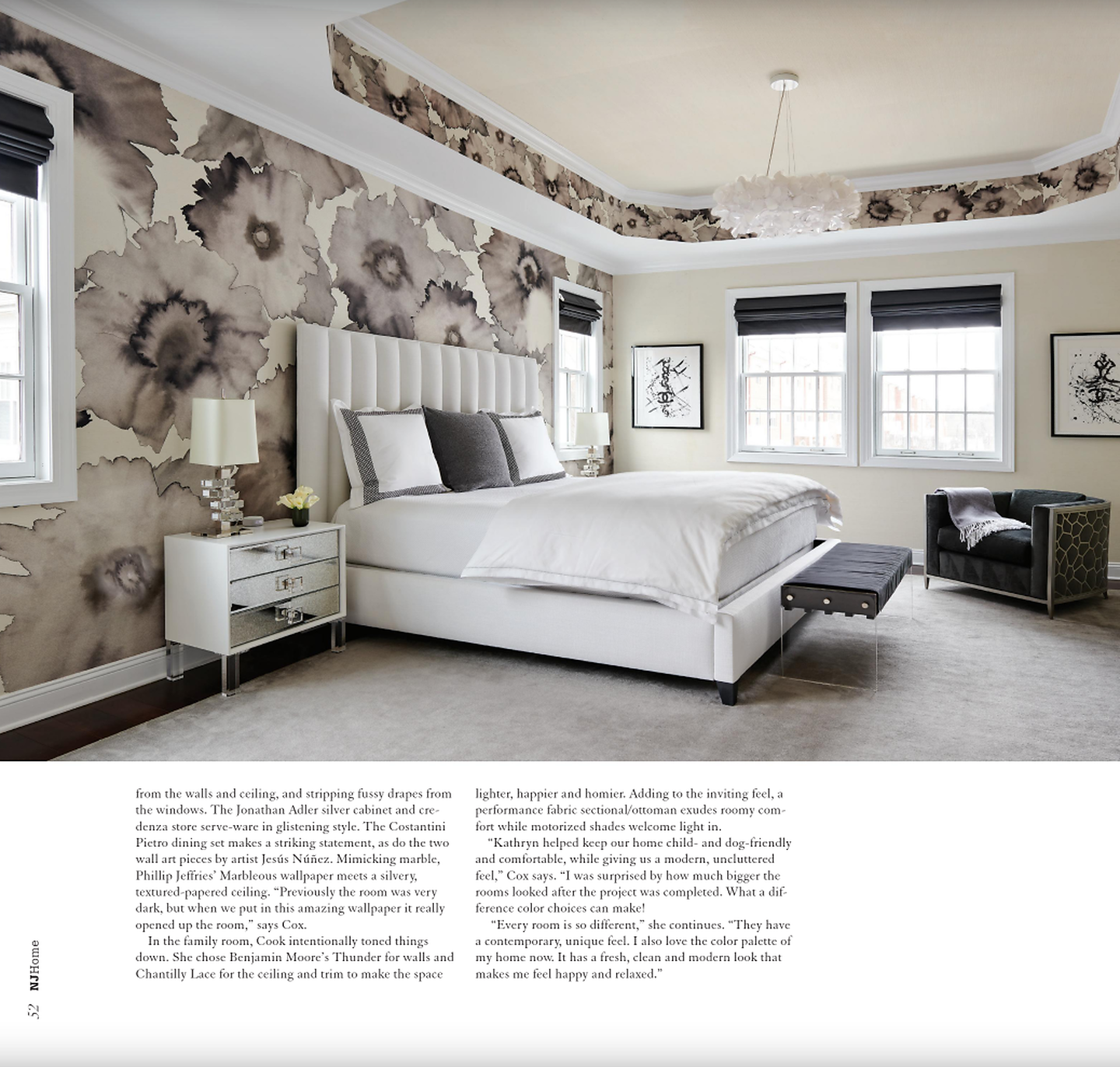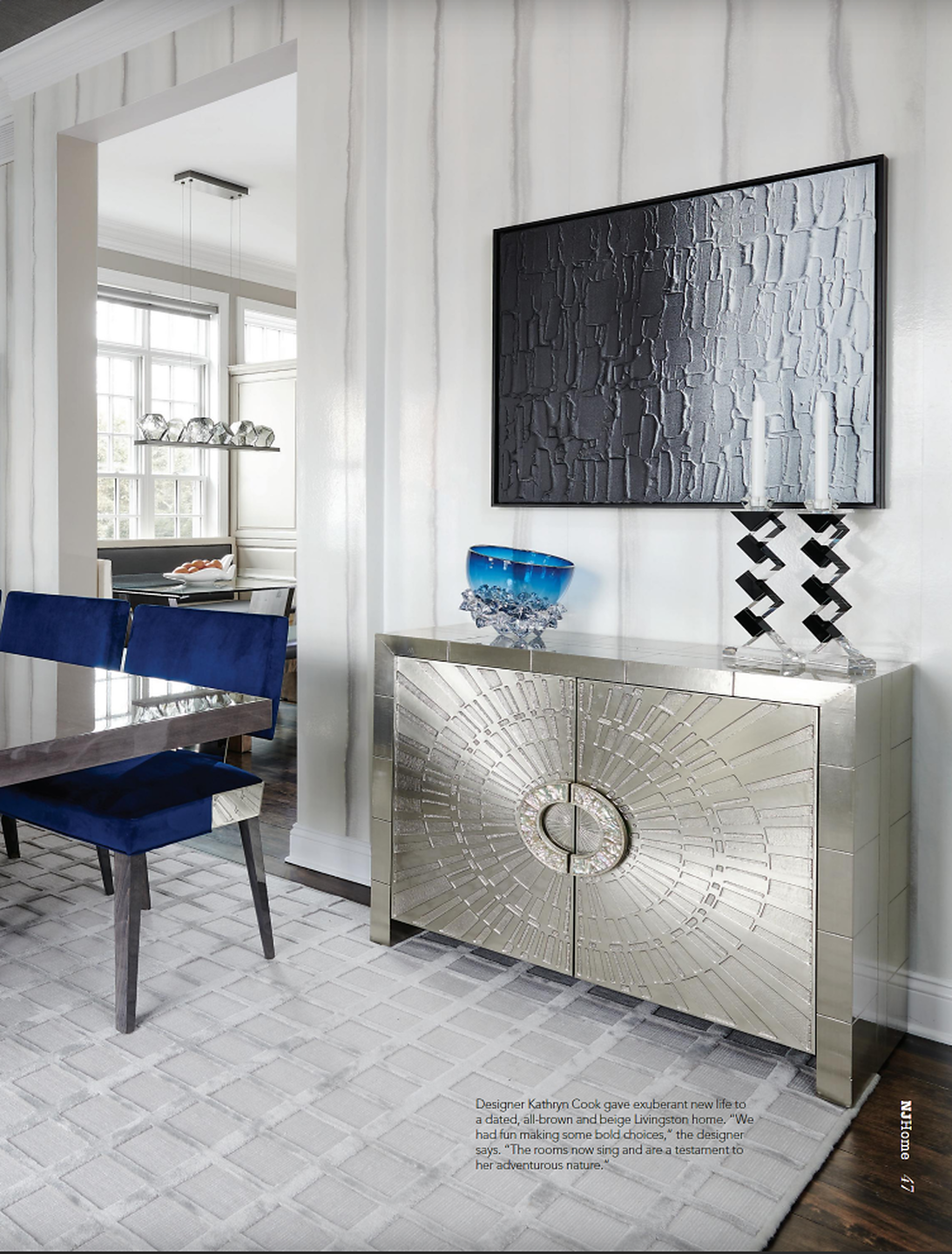 In article, "Modern Exuberance," interior designer Kathy Cook featured Marbleous 5960 Bianco Perla in the dining room, Rivets® 5700 Gold in the study, and Blossom Custom in the bedroom of a client's home.