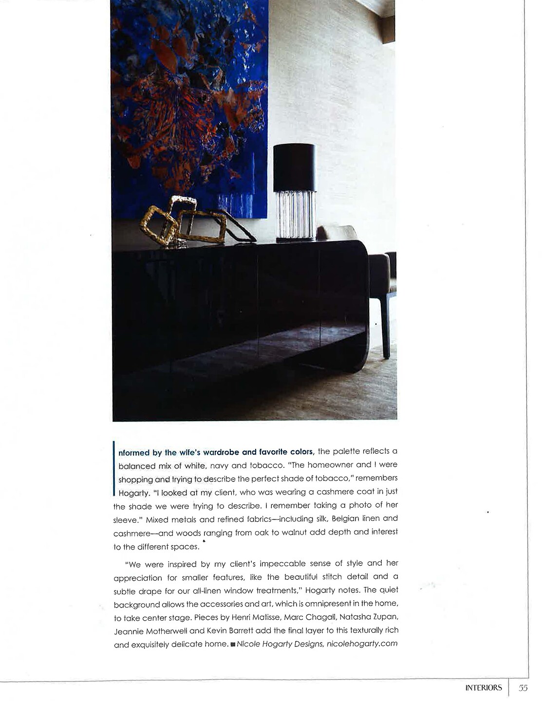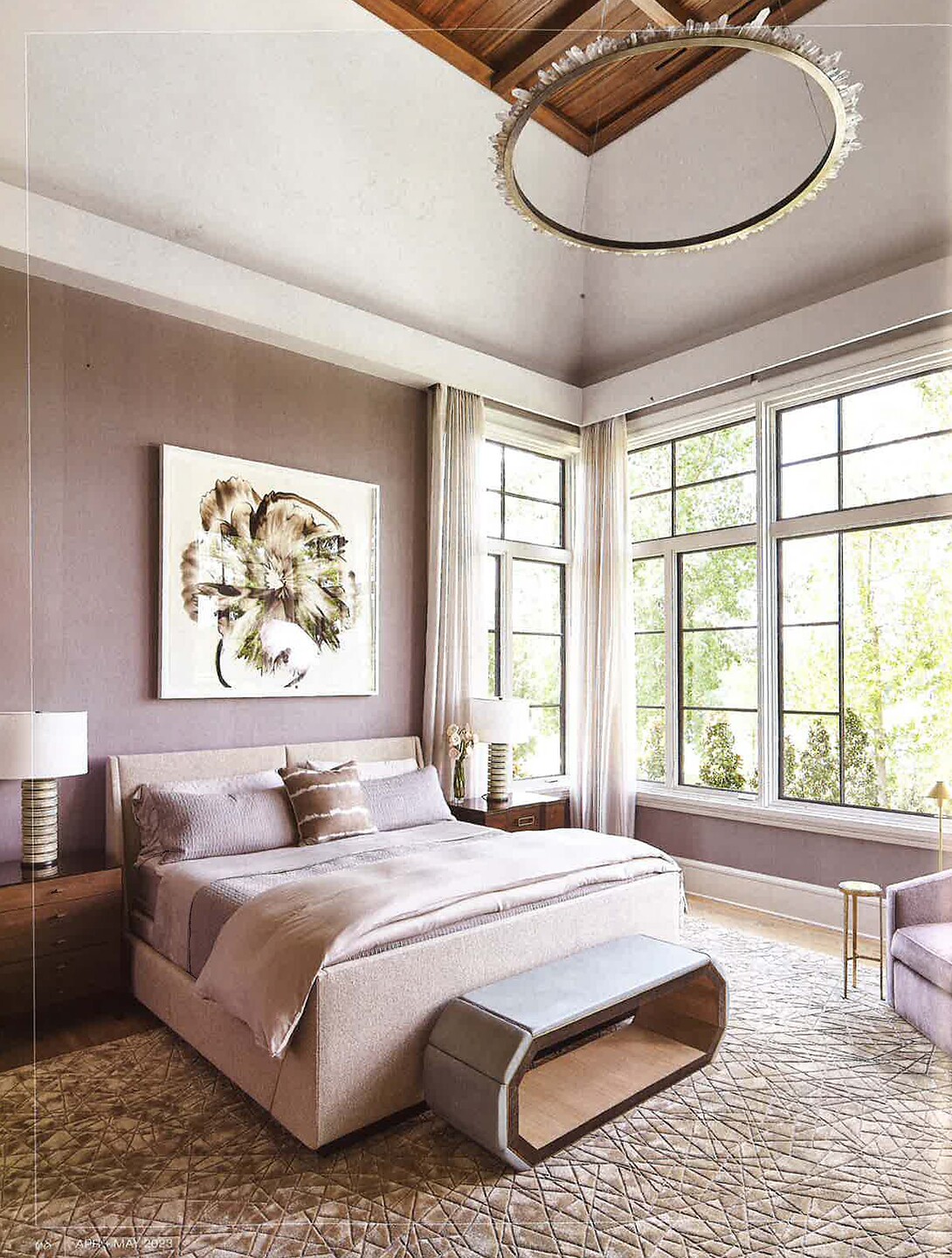 In article, "A Fresh Start," interior designer Nicole Hogarty featured Manila Hemp 5233 Fade in the foyer of a client's home. In article, "Delicate Balance," interior designer Layton Campbell featured Sateen and Sateen Shimmer 4944 Chill in the bedroom of a client's home.