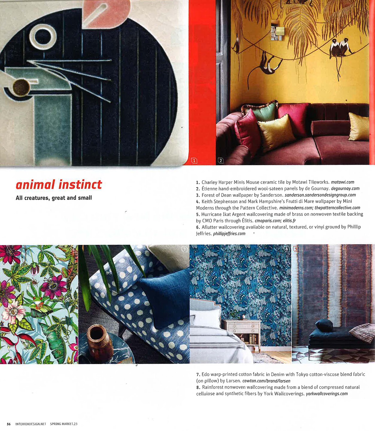 In article, "Fabric & Wallcovering," Phillip Jeffries' Aflutter 9837 Azure Coast is featured among new animal inspired wallcovering products.