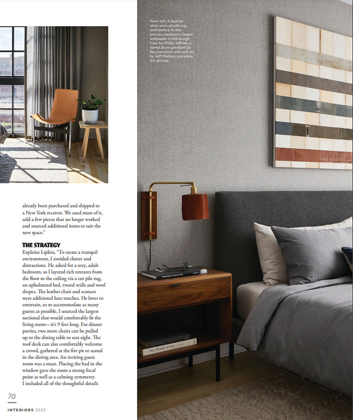In article, "Trading Spaces," interior designer Liz Lipkin features Tweed 5453 Edinburgh Grey in the primary bedroom of her client's dream condo.