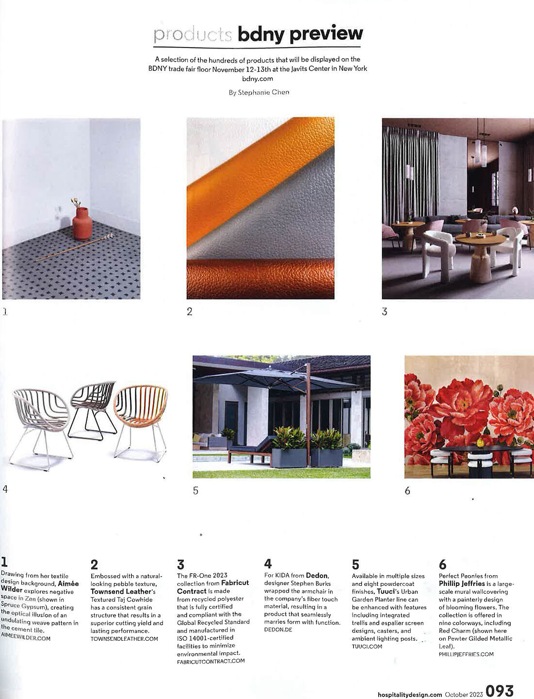 In article, "Products BDNY Preview," Perfect Peonies 10173 on Pewter Gilded Metallic Leaf is featured among products debuting at BDNY.