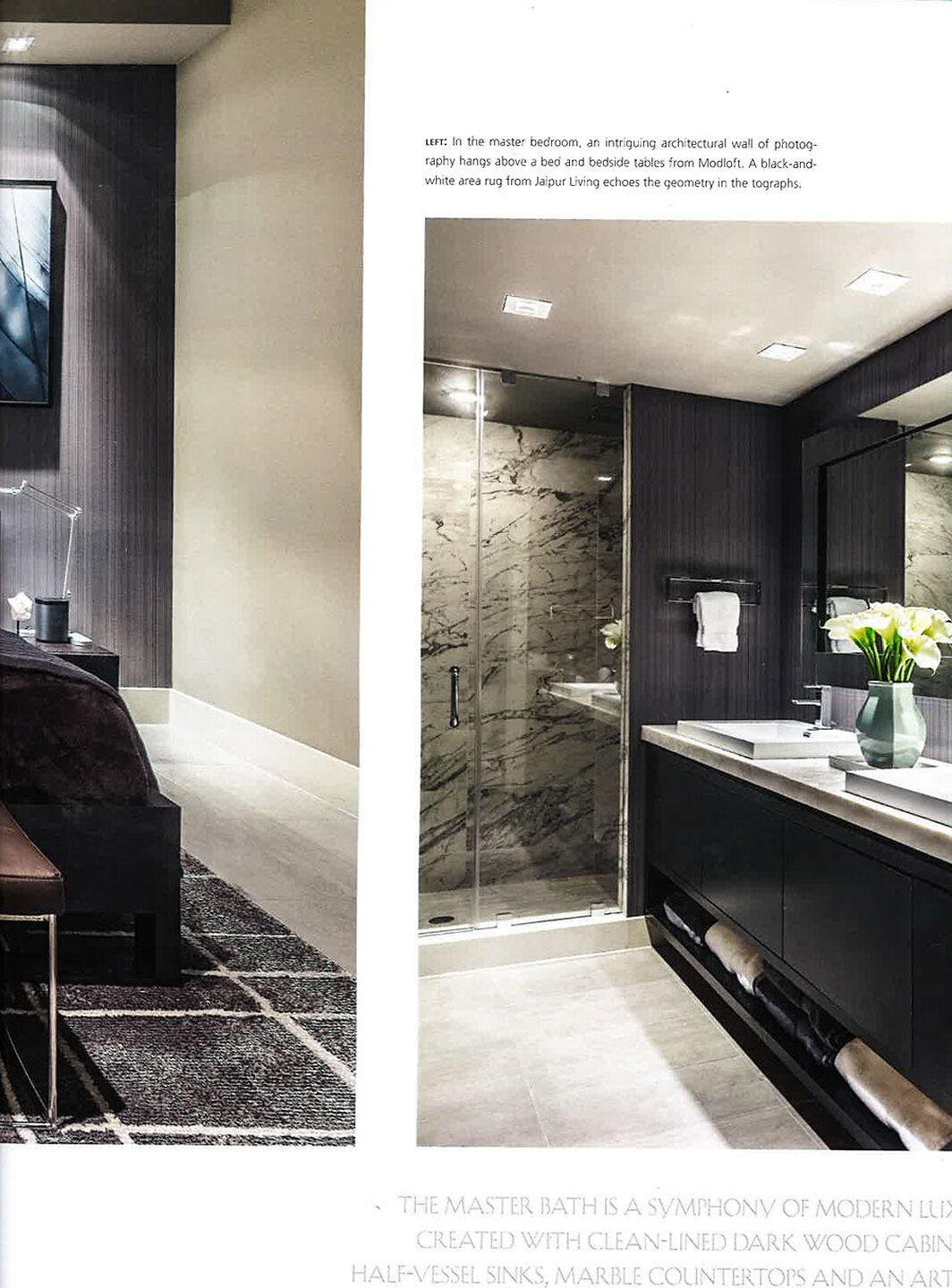 In article, "Design With An Artist's Touch," Studio 33 Interiors featured Fringed 4748 Black Tie in the master bedroom and bathroom of a client's home.
