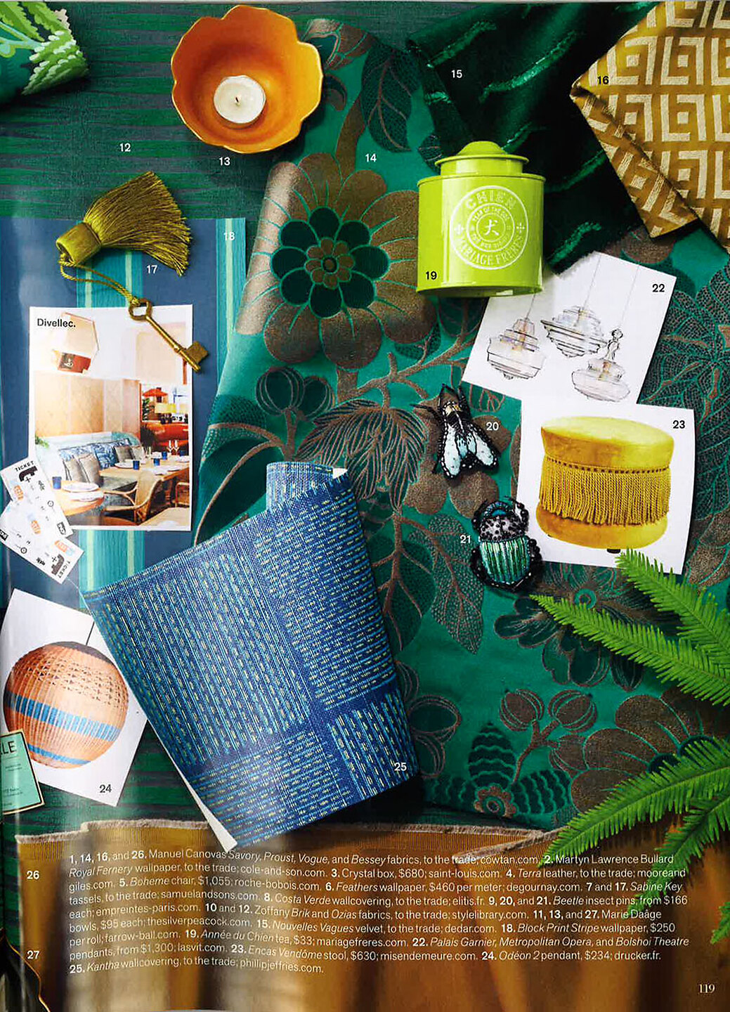 In article, "Boutique Chic," Kantha 2585 Tibetian Teal on Peacock Blue Manila Hemp is featured among jungle themed design elements