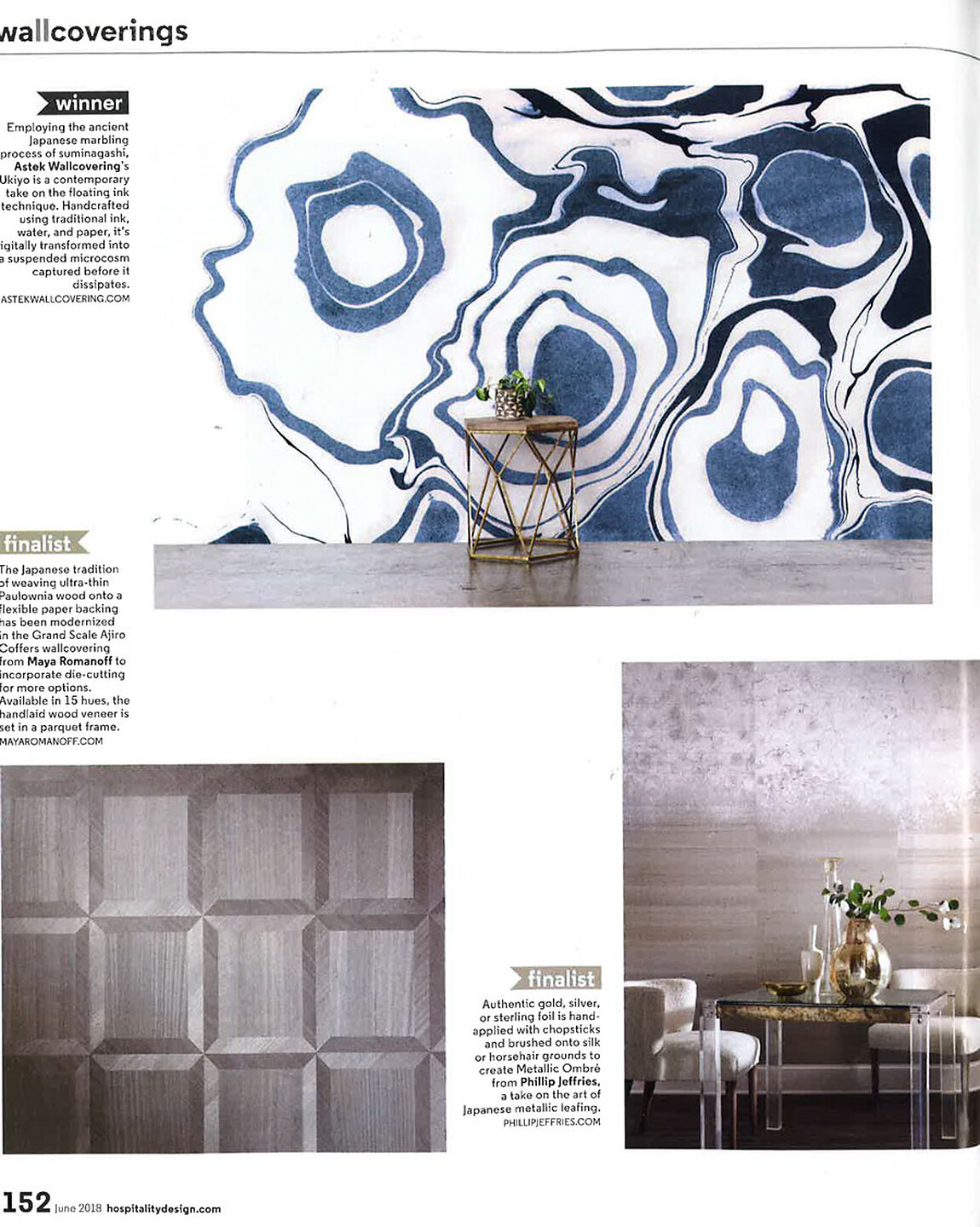In article, "Hospitality Design Awards," Metallic Ombre 3160 Silver is featured as a finalist for the wallcovering categoy.