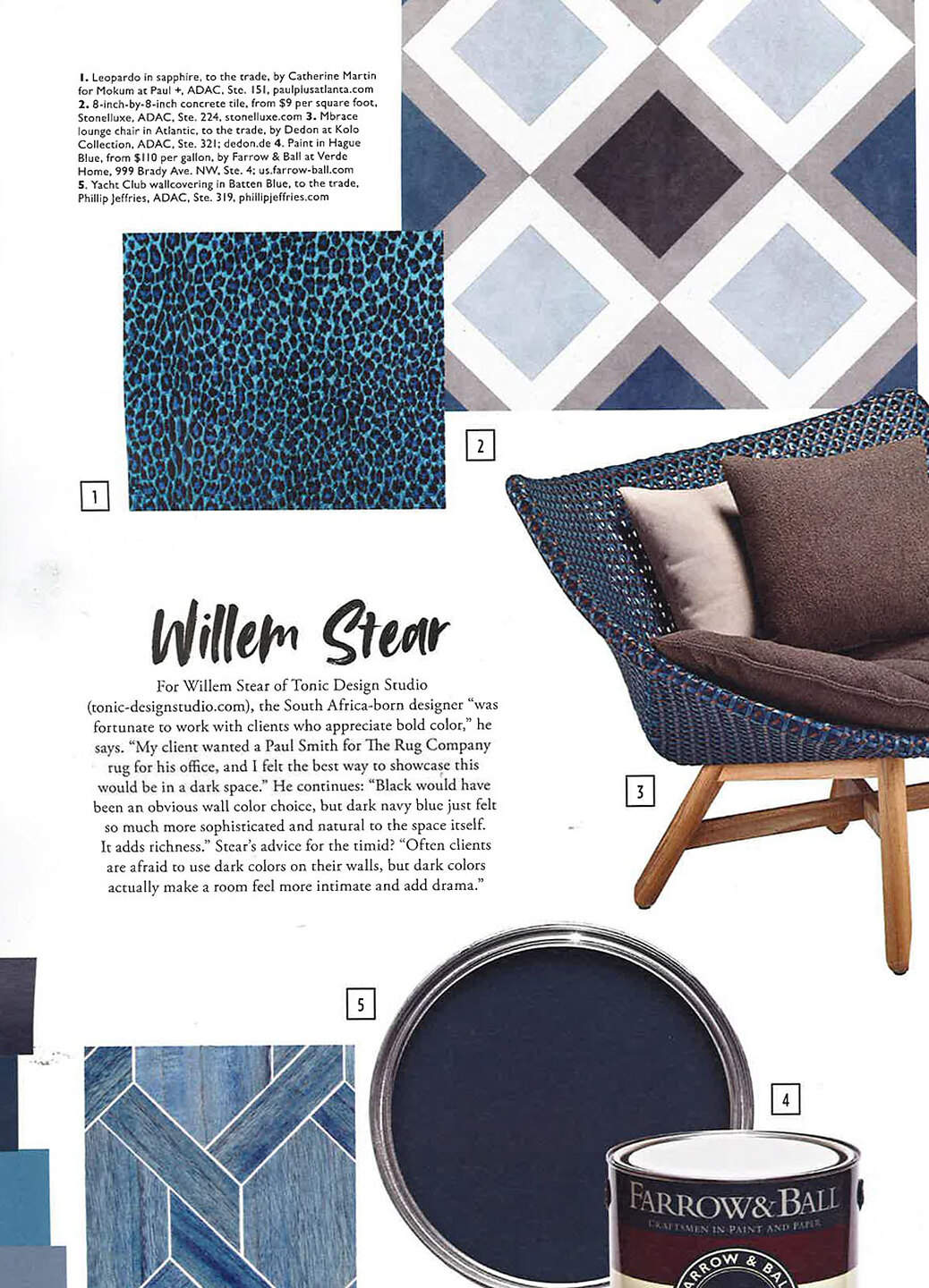 In article, "Willem Stear," Yacht Club 4294 Batten Blue is featured as a color that can add drama to any room.