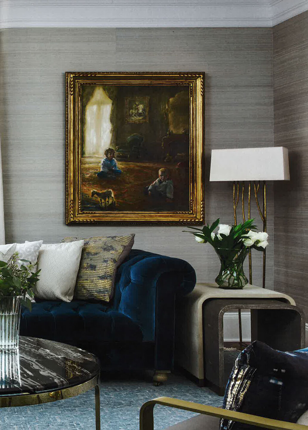 In article, "Classical Meets Deco," Interior Designer Susan Knof featured Amalfi Silk 4355 Tirreno Blue in the formal living room of a client's home.