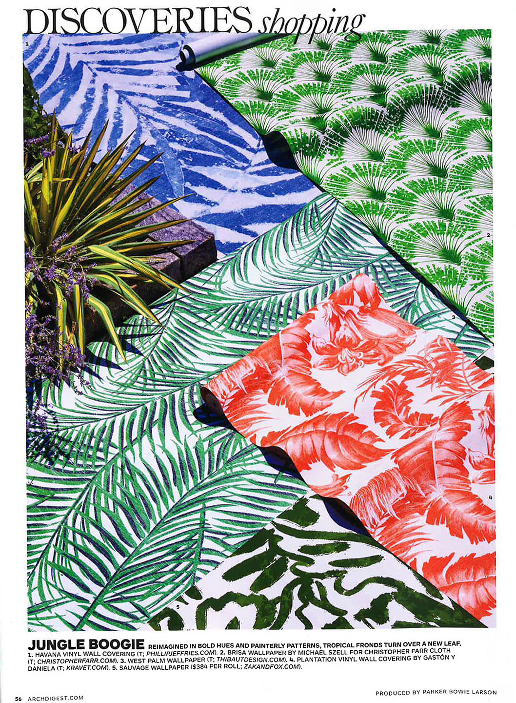 In article, "Discoveries Shopping," Havana 6095 Tango Nights on Snowfall Vinyl Glam Grass is featured as a reimagined bold hue and tropical trend.