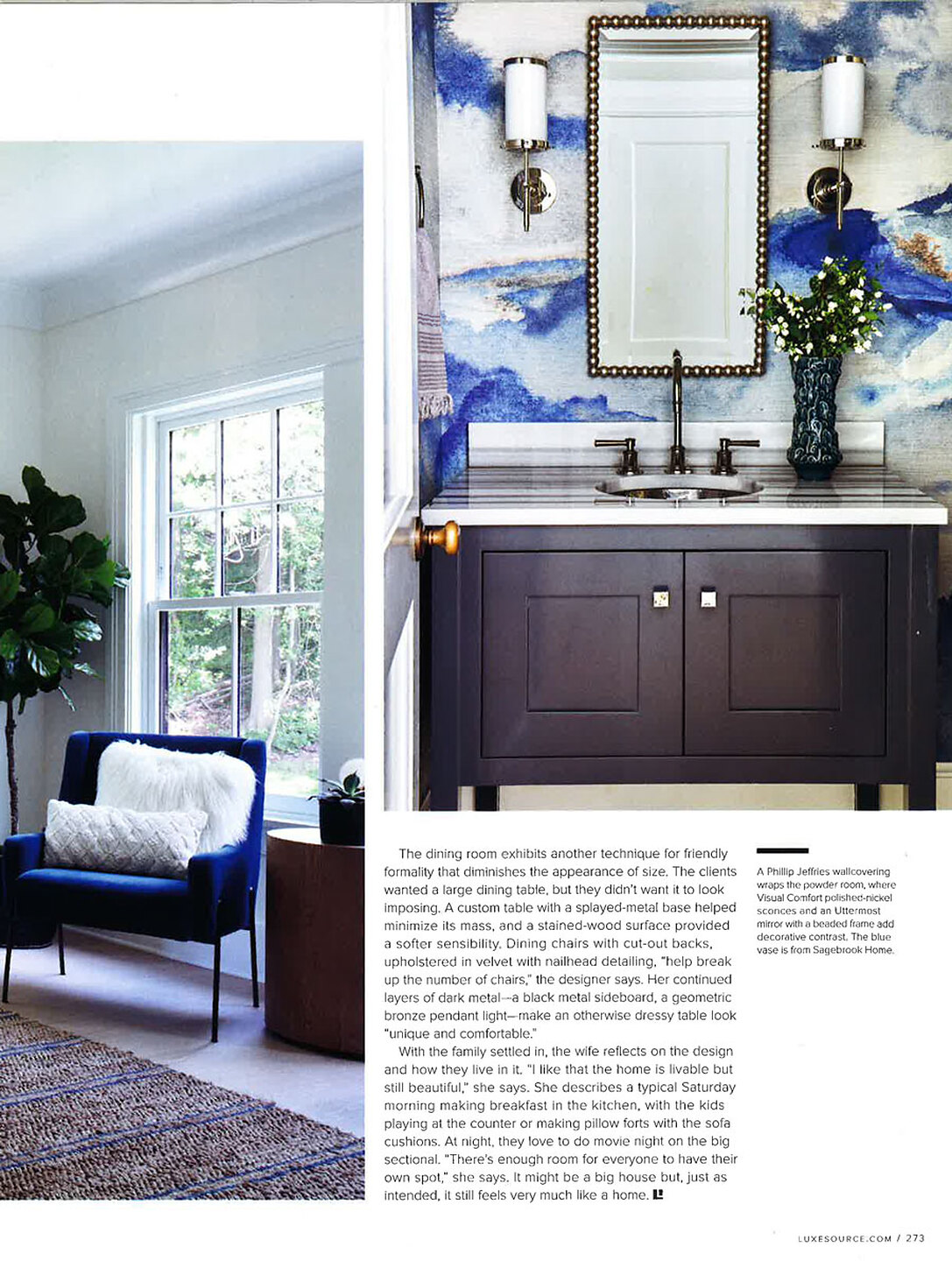 In article, "Warming Trend," Mark Finlay Interiors featured Beyond 7202 Indigo Horizons on Vinyl Glam Grass in the powder room and Rivets 5719 Nickel on Graphite Manila Hemp in the butler's pantry of a client's home.